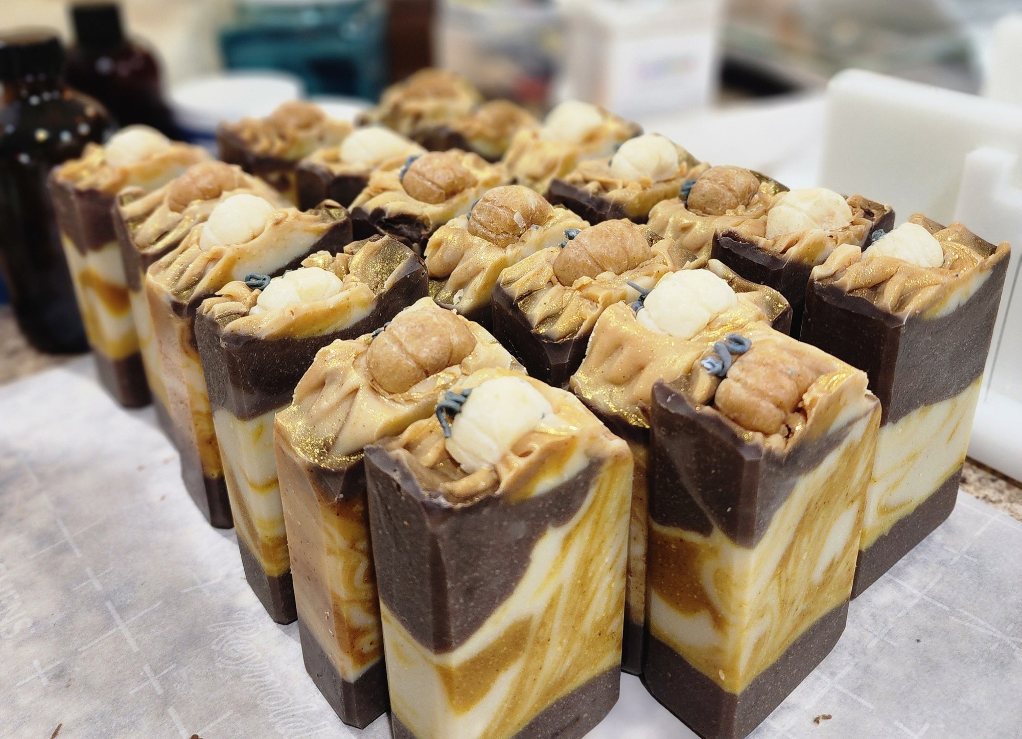 Ingredients: olive oil, coconut oil, lard, shea butter, coconut milk, distilled water, lye, palm oil, castor oil, rice bran oil, colloidal oats, sugar, mica, fragrance oil, turmeric powder & tussah silk.